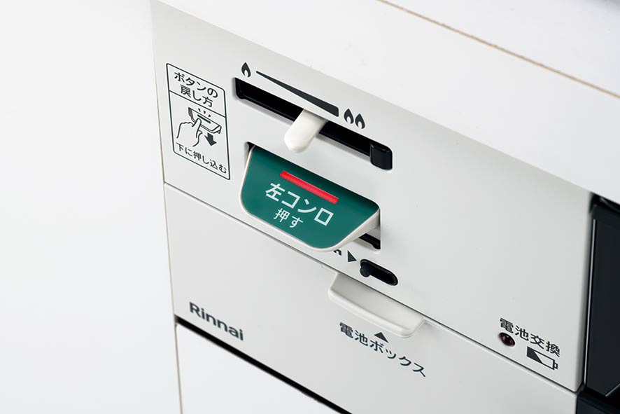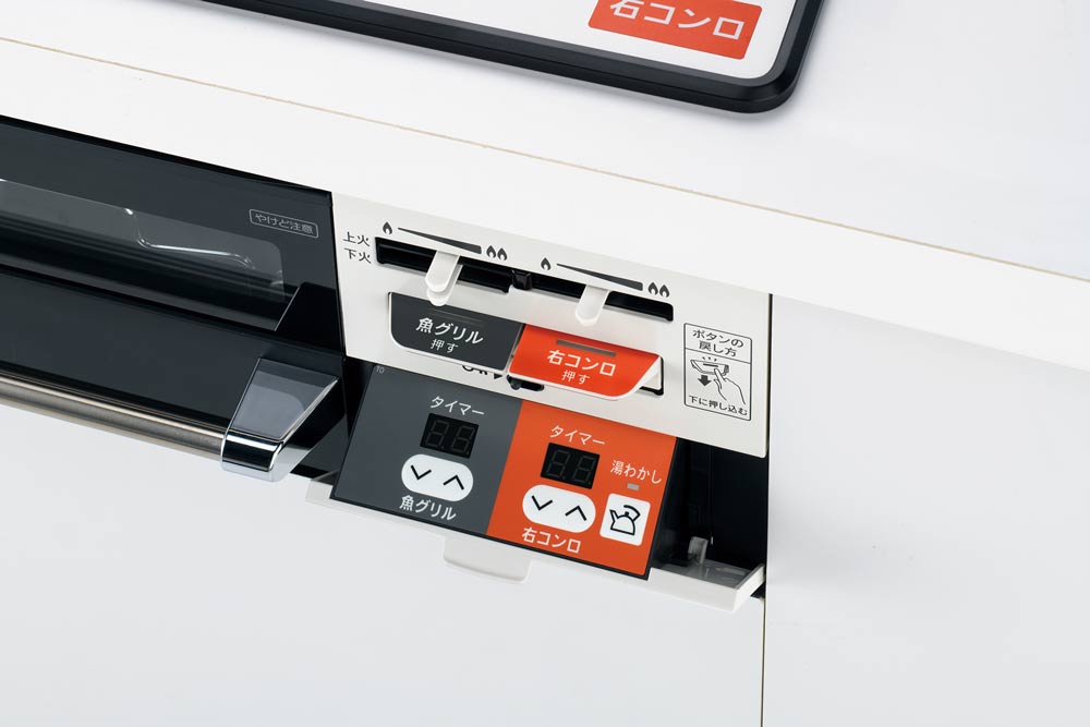 左右2つのコンロとグリルのスイッチをそれぞれ色分けし、使用中は点火していることがひとめで分かるよう、スイッチ内にLEDランプを点灯させることで点火ミス・消火忘れなどの事故を防ぐなど、さまざまな配慮が見て取れます。