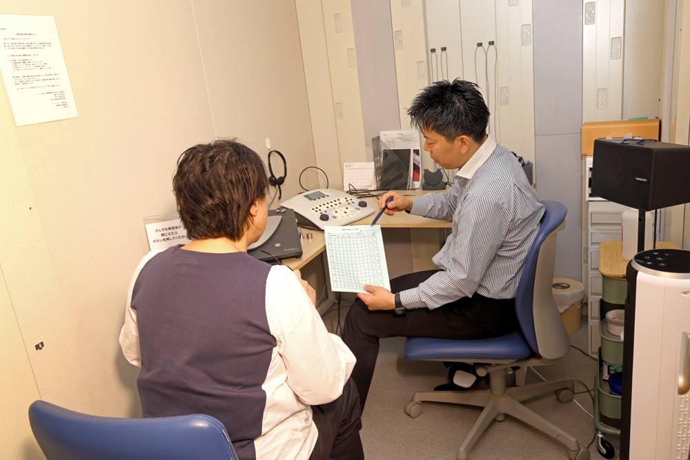 「来店前、耳鼻科などで聴力検査を実施したばかりで、その結果もお持ちいただいているという場合はきこえのチェックを割愛することもあります。が、言葉の聞き取りチェック(語音明瞭度・ごおんめいりょうど)は、補聴器のフィッティングをするうえで非常に重要ですので、ご来店された皆さまに受けていただいています」