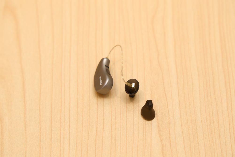 補聴器には本体を耳の中に入れて使用する「耳あな型」、本体は耳の後ろにかけ、先端のイヤホンのみを耳に入れて使う「耳かけ型」(写真)などのタイプがあります。また、電池交換が必要なのか、充電式なのか、環境や目的に合わせた音の調整が可能か……など、それぞれの性能・機能によって価格も大きく異なります。